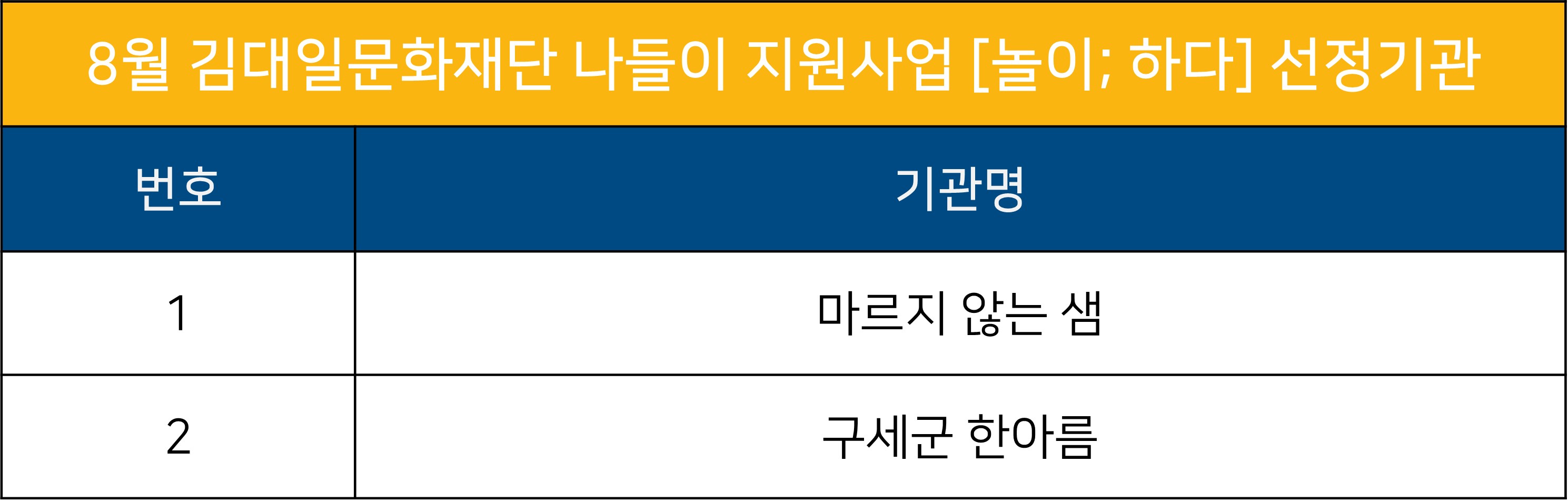2025년 김대일문화재단 나들이 지원사업 [놀이; 하다] 8월 선정기관을 아래와 같이 안내드립니다.