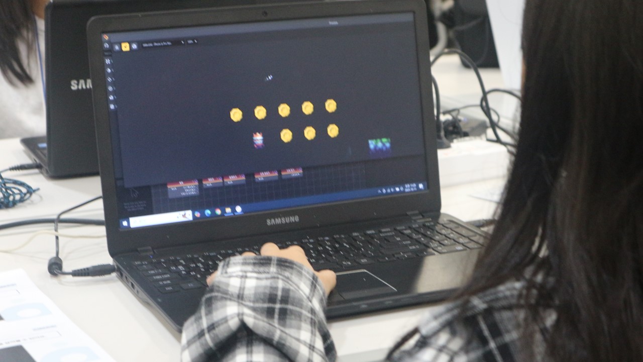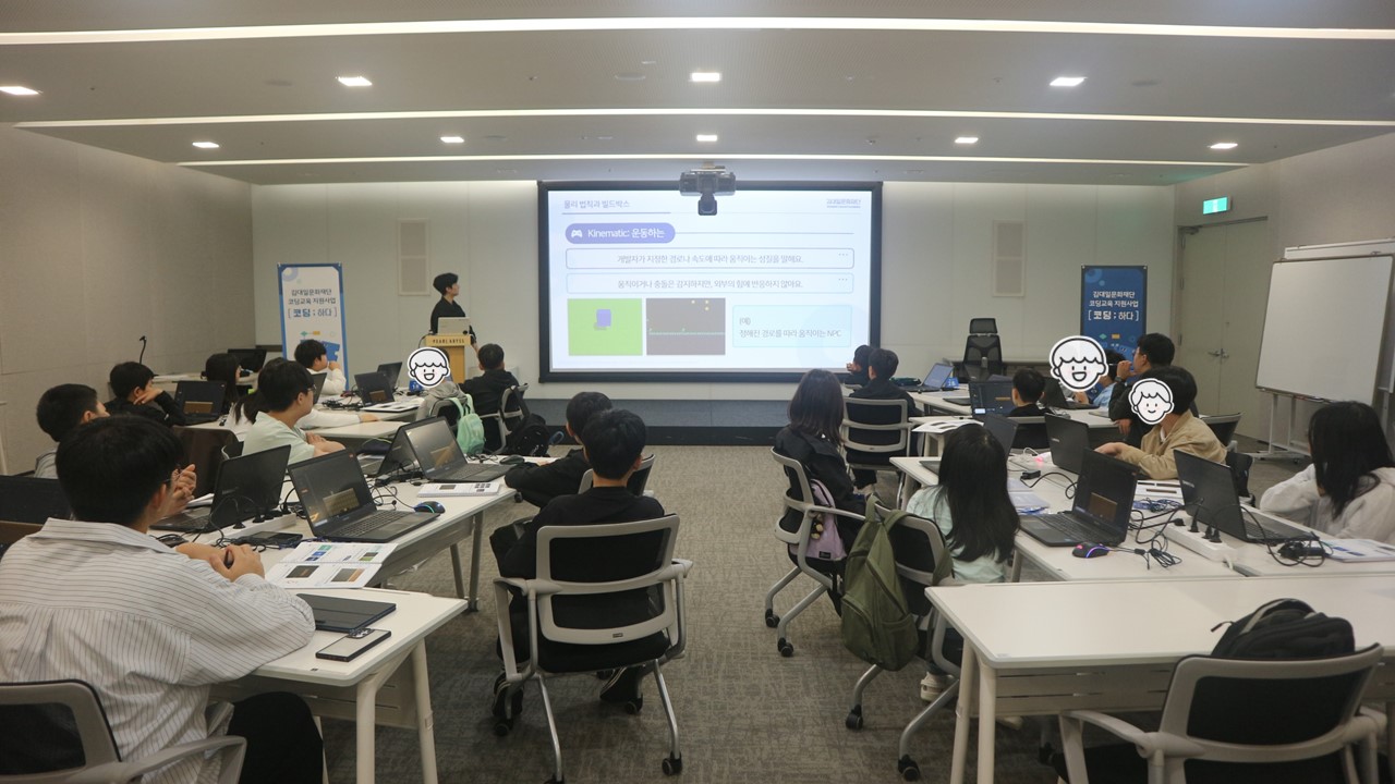 마지막에는 자신만의 맵을 만들어보는 실습이 이어졌는데요. 각자 상상력을 발휘해 만든 공간에서 캐릭터가 움직이고, 점프하고, 부딪히는 재밌는 장면들이 교실을 가득 채웠습니다. 작은 버그를 해결하기 위해 머리를 맞대는 모습도, 완성된 맵을 자랑하며 웃는 얼굴도 참 인상적이었습니다.